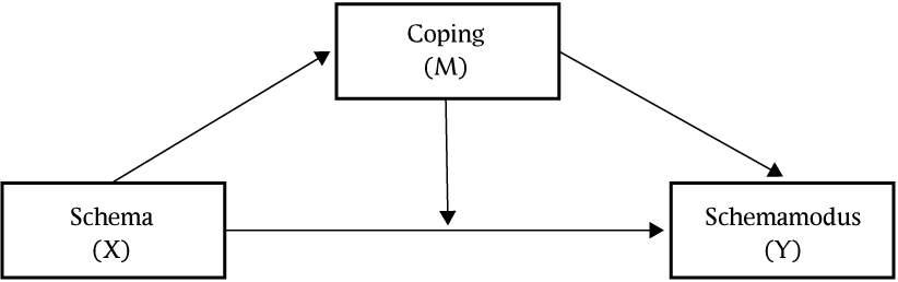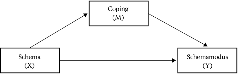 Tabel 1 toont een uitwerking van de theorie dat schema's en copingreacties samen tot verschillende modi en bijbehorend gedrag leiden. De relaties tussen schema's, coping en modi zijn bevestigd in een wetenschappelijk onderzoek onder een grote groep volwassenen (Rijkeboer & Lobbestael, 2012). Dit onderzoek liet zien dat copingreacties een mediërende rol hebben in de relatie tussen schema's en schemamodi. Deze mediatie betekent dat een bepaald schema een copingreactie oproept, en dat deze reactie vervolgens leidt tot een schemamodus (zie figuur 1). Als dit het geval blijkt te zijn, is het wellicht logisch om een psychologische behandeling van probleemgedrag, dat bij de schemamodi hoort, meer te richten op de schema's en onderliggende basisbehoeften dan op de coping. De schema's houden immers de disfunctionele coping in stand, en zijn daarmee van invloed op het gedrag.