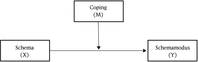 Men kan echter ook verwachten dat coping niet, of niet alleen, een mediërende rol heeft in de relatie tussen schema's en schemamodi, maar dat er (ook) sprake is van een modererende rol. Moderatie wil in dit geval zeggen dat het afhangt van de copingreactie of, en in welke mate, het schema een effect heeft op de schemamodus (figuur 2). Dit zou een grotere behandelfocus op de coping impliceren dan in het geval van mediatie. Ook een combinatie van mediatie en moderatie, zogeheten 'gemodereerde mediatie', behoort tot de mogelijkheden: het effect van het schema op coping, en via de coping op de schemamodus, is dan afhankelijk van die (mate van) disfunctionele coping (figuur 3).