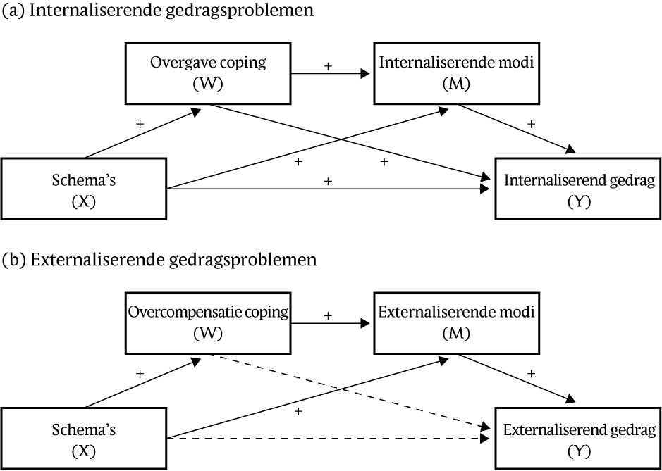 Figuur 4 Model (stap 4) voor de relaties tussen het schemadomein Onverbondenheid en afwijzing op internaliserende gedragsproblemen (a) en externaliserende gedragsproblemen (b) via coping en schemamodi. Statistisch significante, positieve coëfficiënten (< 0,001) zijn aangegeven met +; stippellijnen representeren niet-significante coëfficiënten.