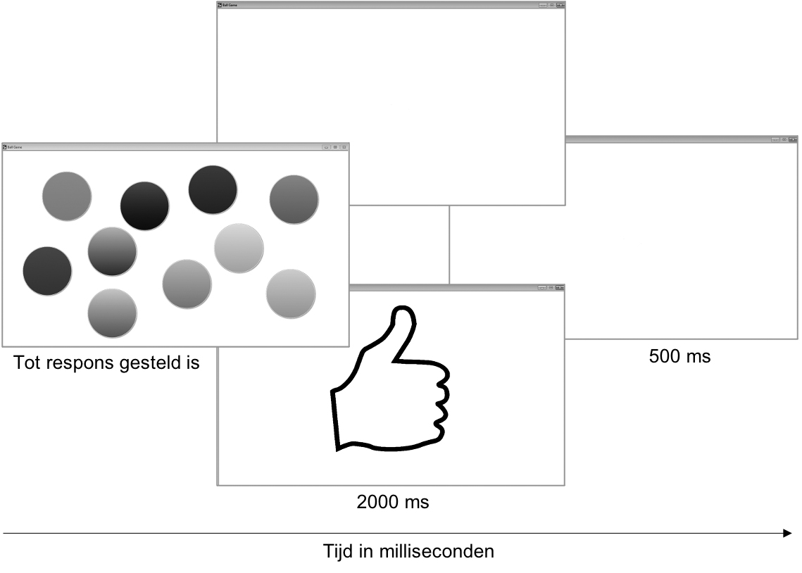 Kinderen zaten voor een touchscreen computer in een testkamer. Elk kind kreeg de volgende instructie: 'Je zult zo dadelijk een spel spelen. Let goed op, want er wordt geen verdere instructie gegeven.' Vervolgens verschenen de instructies van de taak op het scherm. Deze werden voorgelezen door de testleider: 'Zo meteen verschijnen er 10 gekleurde ballen op het scherm. Door het drukken op de ballen kan je snoepjes verdienen. Als het goed is, verschijnt er een duim op het scherm en krijg je een snoepje, dat je direct kan opeten. Als het fout is, verschijnt er niets. Heb je nog vragen? Zo niet, dan kan je op de startknop drukken. Succes!' Er werden geen verdere instructies gegeven. Als het kind verduidelijking vroeg of niet startte met de taak, werden de instructies herhaald. De testleider bleef in de kamer tijdens de afname van de taak. Aan het einde van de hele testsessie kregen de families 10 euro voor deelname aan de studie.