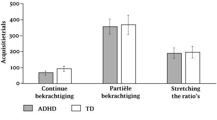 Uit de 2 (groep) x 3 (conditie) ANOVA op het totaal aantal acquisitietrials bleek zoals verwacht een hoofdeffect van conditie, F(2, 105) = 32,11, p < 0,001, η2p = 0,380 (tabel 3 en 4).6 Uit de Bonferroni-gecorrigeerde post-hoc test bleek dat het aantal acquisitietrials significant verschilde tussen alle drie de condities (pPB-CB < 0,001, pPB-StR < 0,001, pCB-StR = 0,001). Kinderen hadden de meeste acquisitietrials nodig tijdens partiële bekrachtiging (M = 364,43),7 gevolgd door stretching the ratio's (M = 195,59) en continue bekrachtiging (M = 81,35). Tegen onze verwachtingen in waren er geen significante verschillen in acquisitietrials tussen de groepen (ADHD versus controle) over de condities; er was geen hoofdeffect van groep (kinderen met ADHD versus control kinderen) noch een significant interactie-effect (figuur 2).