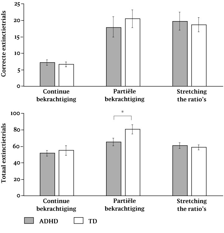 Gedurende de twee minuten extinctie drukten kinderen met ADHD minder vaak op een cirkel dan controlekinderen. Echter, na correctie voor multiple testing was dit effect niet meer significant (Bonferroni p < 0,025). Tot slot werden er geen groepsverschillen gevonden voor het aantal extinctieresponsen in de continue of de stretching the ratio's-conditie (figuur 3).