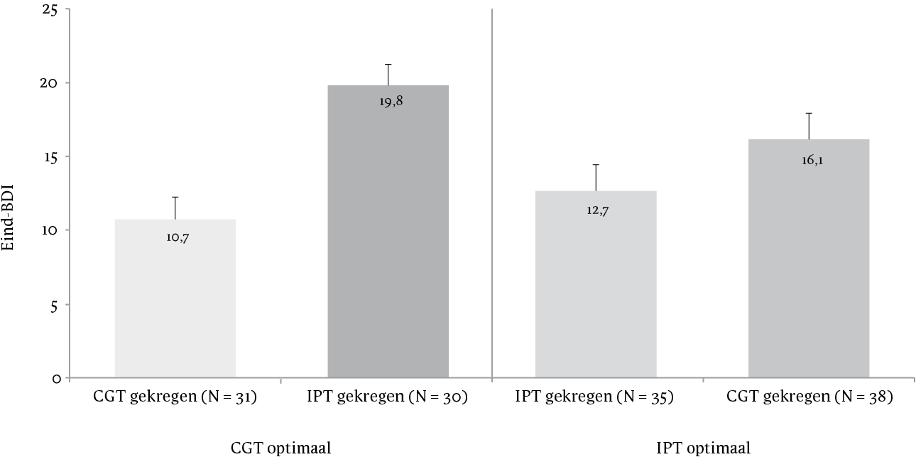 Samen met medewerkers van de DeRubeis-groep herhaalden we de PAI-methode (Huibers et al., 2015), deze keer met data uit onze Maastrichtse behandelstudie waarin we de effecten van CGT met IPT vergeleken (Lemmens et al., 2015). Eerst onderzochten we de moderatoren in onze studie en vonden zo zes verschillende factoren. Een hoge mate van somatische klachten, paranoïde symptomen, interpersoonlijke zelfopoffering en het aantal negatieve levensgebeurtenissen in het afgelopen jaar voorspelden een betere uitkomst van CGT ten opzichte van IPT, terwijl louter de aanwezigheid van cognitieve problemen een betere uitkomst van IPT ten opzichte van CGT voorspelde. Vervolgens berekenden we de PAI voor individuele patiënten en vonden we in deze groep een gemiddelde PAI van bijna 9 punten op de BDI. Dat is hoog, als men zich bedenkt dat 5 punten op de BDI al klinisch relevant zijn. We vergeleken ook de depressieve klachten na afloop van de therapie tussen de mensen die volgens het model een optimale en zij die een niet-optimale behandeling hadden gekregen. In figuur 1 is te zien dat de patiënten die volgens het model CGT zouden moeten krijgen en ook daadwerkelijk CGT hadden gekregen veel minder depressief waren na de behandeling (een gemiddelde BDI van 10,7) dan de patiënten die volgens het model CGT zouden moeten krijgen maar IPT hadden gekregen (een gemiddelde BDI van 19,8). Eenzelfde verschil zien we in de groep die volgens het model beter IPT had gekregen, zij het iets kleiner dan in de CGT-optimaal-groep.