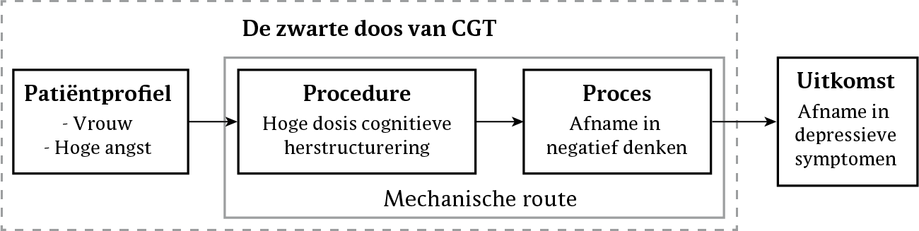 Ik schets hier de contouren van een nieuwe onderzoeksaanpak die we op dit moment aan het uitwerken zijn. In figuur 2 heb ik CGT weergegeven als een zwarte doos, omdat we nog maar weinig weten over de causale keten van verandering die ertoe leidt dat patiënten opknappen in therapie. Elke therapeut zal herkennen dat verschillende personen verschillend reageren op wat er gebeurt in de therapie, en dat het proces van verbetering verschilt van persoon tot persoon. De empirische hamvraag is of we deze causale keten door onderzoek in beeld kunnen krijgen en daarmee het gewenste antwoord op de voor-wie-werkt-wat-vraag.