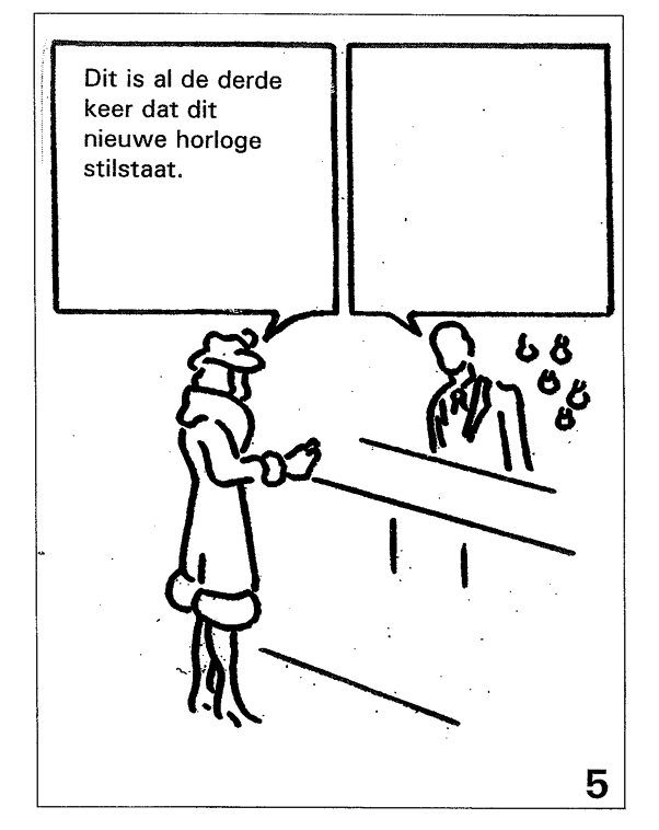 De Aangepaste versie van Rosenzweigs (1978) Picture-Frustration Study (PFS-AV; Hornsveld et al., 2007) is ontwikkeld om vijandigheid te meten. Het instrument vraagt deelnemers om hun reacties op 12 cartoonachtige plaatjes op te schrijven. Respondenten krijgen de opdracht om de situatie te bekijken zoals weergegeven op een plaatje (bijvoorbeeld een klant die tegen een winkelier zegt: 'Dit is al de derde keer dat dit nieuwe horloge stilstaat.') en om in de lege tekstballon de reactie op te schrijven die meteen in hun gedachten opkomt (figuur 1). De antwoorden worden gescoord door een ervaren en onafhankelijke onderzoeksassistent (psycholoog) op een zevenpuntsschaal, die loopt van 1 = 'helemaal niet vijandig' tot 7 = 'extreem vijandig'. In de PFS-AV-handleiding worden voorbeelden van scoring op de zevenpuntsschaal gegeven om zo de interbeoordelaarsbetrouwbaarheid te bevorderen (Hornsveld, z.d.).