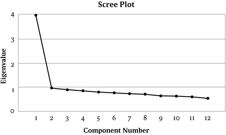Met de gecombineerde deelnemers (N = 842) werd een exploratieve factoranalyse (EFA) uitgevoerd op de 12 items van de PFS-AV om de onderliggende structuur te onderzoeken. Principale componentenanalyse en Varimax-rotatie met eigenwaarde 1 resulteerden in een éénfactoroplossing, die 33% van de totale variantie verklaart (figuur 2).