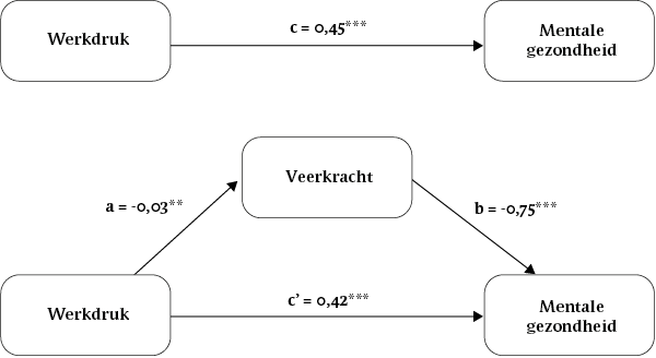 Vervolgens is getest of veerkracht de relatie tussen werkdruk en mentale gezondheid medieert (zie tabel 3). De resultaten laten zien dat de relatie tussen werklast en veerkracht (pad a; zie figuur 1) negatief en significant was (β = -0,03, t = -2,70, p = ,007). De relatie tussen veerkracht en mentale gezondheid (pad b; zie figuur 1) was negatief en significant (β = -0,76, t = -6,95, p < ,001). Verder is het totale effect van werkdruk op mentale gezondheid (pad c; zie figuur 1) significant (β = 0,45, t = 14,15, p < ,001). De algemene bevindingen toonden een positieve en significante impact op de werkdruk en op de mentale gezondheid (pad c’; zie figuur 1) door veerkracht (β = 0,42, t = 13,46, p < ,001). Kortom, uit de resultaten blijkt dat aan alle eisen voor mediatie is voldaan: de effecten a, b en c zijn allemaal statistisch significant, en het directe effect van werkdruk op mentale gezondheid c’ is gelijk aan 0,42 en bevindt zich dus dichter bij nul dan het totale effect (c = 0,45). Aangezien zowel c als c’ significant zijn, medieert veerkracht gedeeltelijk het effect van werkdruk op mentale gezondheid (dat wil zeggen: het vermindert het effect, maar doet het niet helemaal teniet).