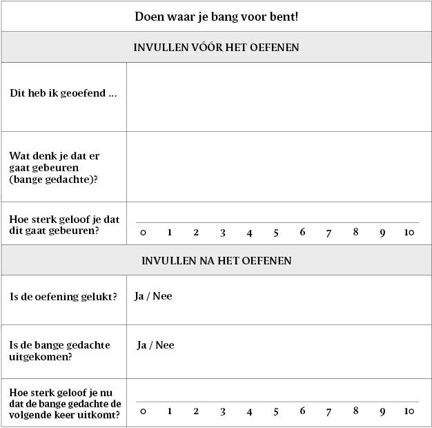 Zowel in de therapie als tijdens de huiswerkopdrachten werd gebruikgemaakt van een registratieformulier (zie figuur 1). Op dit formulier registreerde de cliënt welke situatie hij had geoefend, wat zijn angstige verwachting was ten aanzien van de situatie, hoe geloofwaardig hij deze verwachting vond (op een schaal van 0-10), of de oefening gelukt was, of de angstige verwachting was uitgekomen (ja/nee) en als laatste hoe hij de geloofwaardigheid scoorde na de exposureoefening (op een schaal van 0-10). Het formulier is samen met de cliënt opgesteld en op meerdere momenten tijdens de behandeling is gecheckt of de cliënt de bedoeling ervan begreep. Hoewel over het algemeen wordt aangeraden ondersteunende visualisaties te gebruiken bij dit soort schalen, vonden we samen met de cliënt geen geschikt plaatje om de 'angstige verwachting' weer te geven. Bovendien had de cliënt wat dit betreft voldoende cognitieve mogelijkheden om op basis van taal en uitleg de schaal te begrijpen. De formulieren zijn steeds door de cliënt, vaak met ondersteuning van groepsbegeleiders of zijn ouders, ingevuld en werden tijdens de wekelijkse sessies nabesproken.