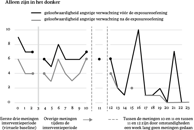 Om de geloofwaardigheid van de angstige verwachting te toetsen, is gebruikgemaakt van een visueel-analoge schaal (VAS). De VAS-schaal werd in 1921 voor het eerst gebruikt door Hayes en Patterson om de subjectieve beleving van pijn te meten. De VAS-schaal is sindsdien op tal van manieren aangepast om verschillende psychologische constructen te meten, zoals pijn, kwaliteit van leven en affectieve staten (de Boer et al., 2004; Delgado et al., 2018; Facco et al., 2011). De VAS-schaal die we gebruikten bestond uit één vraag: 'Hoe sterk geloof je dat jouw bange gedachte uit gaat komen?' Hierbij moest de cliënt op een lijn met cijfers van 0 tot 10 aangeven hoe sterk hij dit geloofde, waarbij de scores opliepen van 0 ('Ik geloof mijn angstige verwachting helemaal niet') tot 10 ('Mijn angstige verwachting is helemaal waar'). De cliënt heeft iedere sessie de geloofwaardigheid van zijn angstige verwachting tweemaal gescoord: één keer voor en één keer na het uitvoeren van de exposureoefening. Omdat het toetsen van de geloofwaardigheid van de angstige verwachting een werkzaam element is van interventies zoals de huidige, was het niet mogelijk om de angstige verwachting als zuivere nulmeting te registreren tijdens de baselineperiode. Op basis van visuele inspectie van de grafiek (zie figuur 2) werd vastgesteld dat de angstige verwachtingen voorafgaand aan de eerste drie sessies voldoende hoog en stabiel waren om te dienen als virtuele nulmeting, waartegen de metingen gedurende overige metingen in de interventiefase zijn afgezet.
