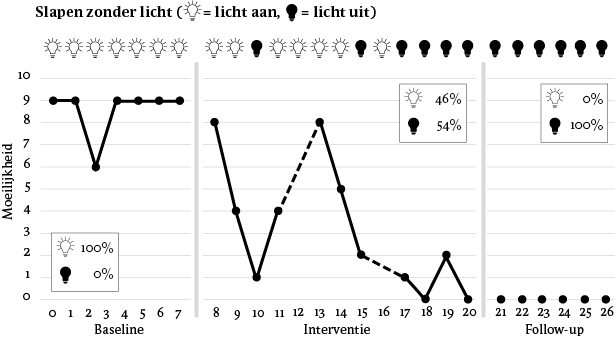 Een tweede maat om het behandeleffect te meten is de afname van vermijdingsgedrag. Om dagelijkse metingen te kunnen uitvoeren, kozen we een specifiek vermijdingsgedrag dat elke dag aanwezig was. Voor de cliënt was dit 'slapen met licht aan' en daarmee vermijden van duisternis. De cliënt beantwoordde dagelijks twee vragen die verwerkt waren in het eerdergenoemde registratieformulier. De cliënt gaf aan of het gelukt was om de voorafgaande nacht zonder licht te slapen (ja/nee) en gaf op een VAS-schaal aan hoe moeilijk dat was, van 0 ('helemaal niet moeilijk') tot 10 ('super moeilijk'). Voor deze uitkomstmaat voerden we 1 week voor de start van de behandeling een voormeting uit, waarbij dagelijks geregistreerd werd. Tijdens de daaropvolgende interventiefase zijn opnieuw dagelijkse metingen uitgevoerd voor de duur van 8 weken. De follow-upmeting bestond opnieuw uit dagelijkse metingen voor een periode van 6 weken na afronding van de behandeling.