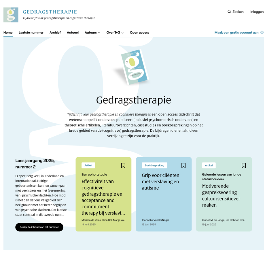 Het jaar 2026 wordt een jaar van grote veranderingen voor Gedragstherapie, Tijdschrift voor Gedragstherapie en Cognitieve Therapie: vanaf maart zal het tijdschrift voor het eerst volledig digitaal verschijnen. Alle artikelen zullen vrij toegankelijk (open access) zijn en overal te lezen – waar en wanneer je maar wilt. Daarmee heb je straks wetenschappelijke kennis over cognitieve gedragstherapie (CGT) altijd binnen handbereik.