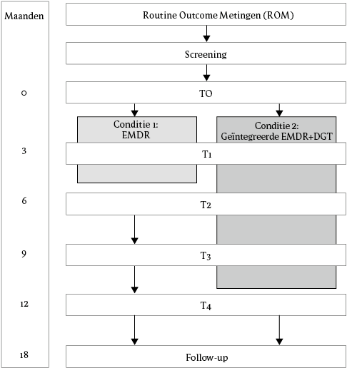 De huidige studie heeft tot doel de gelijktijdige toepassing van EMDR en DGT te vergelijken met EMDR-only bij patiënten met PTSS en comorbide BPS-symptomen. De verwachting is dat het combineren van de effecten van EMDR (klachtenverlichting door verwerking van psychotrauma) en DGT (vaardigheden om emotionele ontregeling te verminderen) leidt tot betere behandelresultaten dan het aanbieden van EMDR-only. Specifiek is de primaire hypothese dat EMDR+DGT leidt tot sterkere afname van PTSS-symptomen na 1 jaar, in vergelijking met EMDR-only. Secundair wordt verwacht dat EMDR+DGT leidt tot grotere afnames in BPS-symptomen, en tot verbetering van algemeen functioneren en kwaliteit van leven, in vergelijking met EMDR-only.