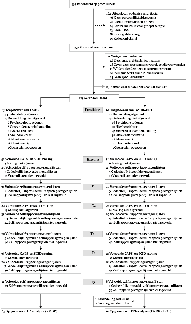 Voor een overzicht van het design van de studie, zie figuur 1 en tabel 1. Tijdens de basismeting (T0) werden PTSS en BPS gemeten met respectievelijk de Clinician-Administered PTSD Scale voor DSM-5 (CAPS-5; Boeschoten et al., 2018; Weathers et al., 2013) en de SCID-5-P (Arntz et al., 2017; First et al., 2016). Na de informed consent-procedure werden patiënten door een onderzoeksassistent willekeurig toegewezen aan EMDR+DGT of EMDR in een 1:1 ratio (n = 4 per block). De CAPS-5 werd opnieuw afgenomen na afronding van de EMDR-behandeling (T2). De CAPS-5 en SCID-5-P werden 6 maanden na afronding van de EMDR-behandeling opnieuw afgenomen, wat samenviel met de voltooiing van DGT in de EMDR+DGT-conditie (T4). Digitale zelfrapportagevragenlijsten werden ingevuld vóór de behandeling (T0), 3 maanden na aanvang van de behandeling (T1), bij voltooiing van EMDR (T2), 3 maanden na T2 (T3), bij voltooiing van DGT (T4) en 12 maanden na T2 (follow-up). Alle metingen werden uitgevoerd door academisch opgeleide onderzoeksassistenten die passende training en supervisie hadden ontvangen, en die niet wisten in welke behandelconditie patiënten waren ingedeeld. Het onderzoeksteam besprak de metingen wekelijks om de betrouwbaarheid te vergroten.