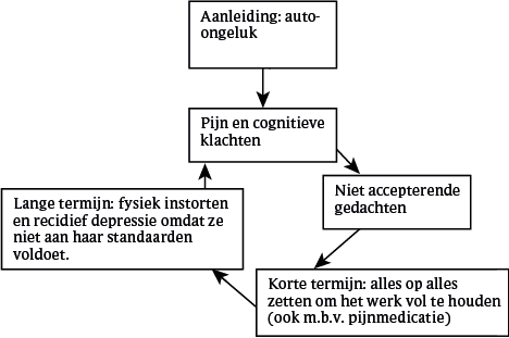 Mw. Mier is een 50-jarige vrouw die zich meldt met pijnklachten, duizeligheid, cognitieve klachten, vermoeidheid en overgevoeligheid voor licht en geluid die optraden na een auto-ongeluk waarbij zij een hersenschudding opliep. Sindsdien kan ze haar werk als secretaresse bij een thuiszorgorganisatie niet meer naar eigen tevredenheid verrichten. Als zij een paar dagen heeft gewerkt voelt ze pijn door haar hele lichaam. Ze kan geen houding meer vinden waarin ze langer dan een paar minuten kan zitten. Met name de hoofdpijn wordt na verloop van tijd ondraaglijk. Met behulp van pijnstillers lukt het haar dan toch om het een paar dagen vol te houden. Uiteindelijk helpen ook de pijnstillers niet meer en rest patiënte niets anders dan zich ziek te melden. Pas dan merkt ze hoe somber ze is. Ze denkt dat ze dit op het werk ook is, maar de afleiding helpt haar er niet bij stil te staan. Op haar werk heeft zij regelmatig het idee dat ze dingen maar voor 80% goed doet. Wie iets voor 80% goed doet, doet het niet voor 100%, zo redeneert patiënte. Van huis uit heeft ze geleerd dat iemand die de 100% niet haalt, het niet goed heeft gedaan. Thuis voelt ze zich al helemaal een 'slappeling'. Bijkomend probleem is dat ze in haar huis steeds geconfronteerd wordt met de leegte sinds haar man drie jaar geleden is overleden. Op AS I werd bij patiënte een depressieve stoornis van matige ernst vastgesteld en een psychische stoornis ten gevolge van een somatische aandoening NAO (status na contusio cerebri). Daarnaast speelt een pijnstoornis. Op As II zijn er trekken van een borderline persoonlijkheidsstoornis.