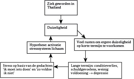De duizelingen waren het minst erg als hij ging liggen. Inmiddels lag hij gemiddeld 18 uur per etmaal op de bank of in bed. De ouders van patiënt vermoeden dat hij veel te hard gewerkt heeft. Patiënt werkte op verschillende plaatsen in de horeca. Soms had hij drie banen tegelijk en werkte hij 70 uur per week. Patiënt denkt zelf niet dat hij te hard gewerkt heeft en beschouwt dit soort werkweken als normaal in de horeca. Hij erkent wel dat hij een periode lang erg veel stress heeft gehad, onder andere doordat de meubelzaak van zijn ouders failliet ging. Hij voelt zich schuldig dat hij nu niet kan voldoen aan de norm van 'normaal werken'. Na verwijzing naar de polikliniek Psychosomatiek van GGZ inGeest worden een ongedifferentieerde somatoforme stoornis en een depressieve stoornis gediagnosticeerd. Hij is bij aanvang ambivalent over behandeling bij de polikliniek. Hij wil wel starten, maar ook de mogelijkheid openhouden om andere behandelopties te proberen als ze op zijn pad komen.