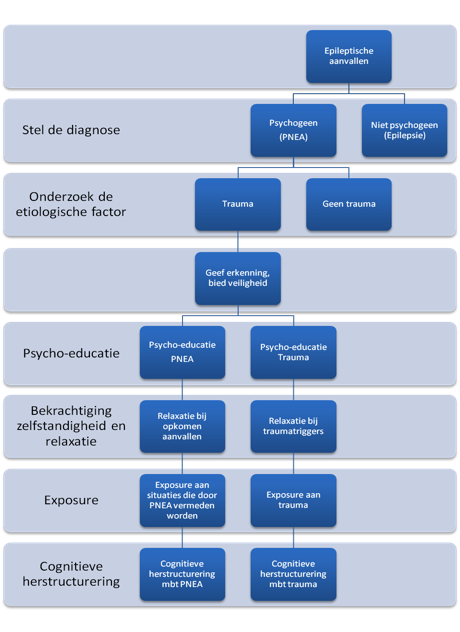 Bij het merendeel van de PNEA-patiënten is psychotherapeutische behandeling echter wél nodig. Cognitieve gedragstherapie (CGT) is tot op heden de psychotherapeutische interventie die in de aanpak van PNEA het beste onderzocht werd (Goldstein, Chalder & Chigwedere, 2010) en wordt daarom aangeschreven als de behandeling met de hoogste mate van doeltreffende evidentie (Baslet, 2012). CGT in de behandeling van PNEA focust zich specifiek op de aanpak van de aanvallen en omvat de volgende werkzame elementen (Baslet, 2012). Binnen een eerste element 'bekrachtiging van zelfstandigheid' wordt de patiënt probleemoplossende vaardigheden aangeleerd, om bij het voorkomen van aanvallen stress te leren verminderen en het zelfvertrouwen te vergroten. Een tweede element betreft het aanleren van relaxatietechnieken en refocusing-technieken om bij de aanvang van een aanval deze te proberen af te afwenden. Een derde element is exposure aan situaties die uit angst voor het voorkomen van aanvallen vermeden worden en cognitieve herstructurering, waarbij de patiënt helpende gedachten leert aan te wenden bij denkfouten die gemaakt worden. Een laatste element betreft terugvalpreventie (Baslet, 2012). Daarbij worden enerzijds alarmsignalen en werkzame therapeutische elementen op een rij gezet om een houvast te hebben bij terugval en zelf aan de slag te kunnen. Anderzijds wordt er duidelijkheid gecreëerd over waar en hoe opnieuw hulp kan gezocht worden indien nodig.