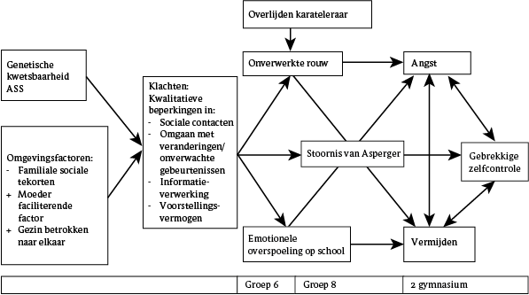 De therapie werd gestart met het opstellen en bespreken van de holistische theorie. De ouders van Daan werd gevraagd om geregeld bij de therapiesessies aanwezig te zijn, in overeenstemming met de aanbeveling van Moree en Davis III (2010). Bij het ontstaan en in stand houden van de problematiek van Daan leek een aantal factoren een rol te spelen die voortkomen uit zijn autismespectrumstoornis. Een ASS gaat vaak gepaard met onder andere moeite met betekenisverlening, voorstellingsvermogen, en emotieherkenning en -regulatie (Happé & Frith, 1996). Deze problemen kwamen bij Daan naar voren doordat het voor hem onduidelijk was hoe zijn angst voor moord, executie en martelwerktuigen is ontstaan, en waardoor hij het in de vorige behandeling niet aandurfde om eraan blootgesteld te worden. Het maken van oorzaak-gevolgrelaties is voor hem mogelijk lastiger dan op basis van zijn intelligentie verwacht mag worden. Daan gaf aan emoties in zijn lichaam te signaleren, maar het lukte hem niet om zelf het verband te leggen met de gebeurtenissen waardoor de emoties opgeroepen werden. Mogelijk heeft hij een verkeerd verband gelegd tussen de dood van zijn karateleraar, de martelbeelden en zijn emoties. Hij was bang geworden om angstig te worden en zijn angsten niet onder controle te kunnen houden. Het 'gevaar' om controle te verliezen lag voor hem continu op de loer doordat hij geen goed (in)zicht had op de uitlokkende factoren. Zijn strategie om angst te voorkomen was om steeds minder te ondernemen, op school vaak het lokaal uit te gaan en het lezen van kranten, en het kijken van journaal en films op televisie, te vermijden. Hij gaf aan niet te weten wat hij moest doen om zijn angsten te voorkomen, te verminderen of te stoppen. Naar eigen zeggen was zijn zelfbeeld in de loop van de tijd steeds negatiever geworden (zie ook figuur 1 voor een schematische weergave van de holistische theorie).
