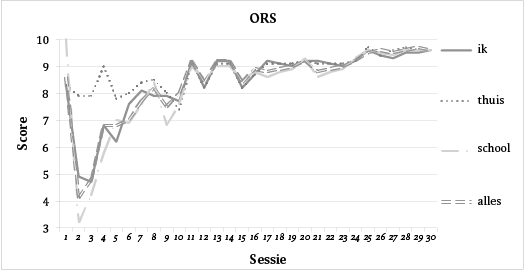Aan het begin van iedere sessie heeft Daan de Outcome Rating Scale (ORS) ingevuld. Deze schaal is onderdeel van de CDOI (Cliënt Directed Outcome Informed) die is ontwikkeld door Miller, Duncan, Brown, Sparks, en Claud (2003), en meet de door cliënt ervaren verandering ten opzichte van de vorige sessie, zowel bij hemzelf, thuis als op school. Het invullen van de ORS had een tweeledig doel: enerzijds gaf het Daan inzicht in zijn vorderingen en anderzijds hielp het de breedsprakigheid van Daan in te perken. De CDOI bestaat oorspronkelijk uit twee formulieren: de ORS en de SRS (Session Rating Scale). De laatste wordt ingevuld vlak voor het einde van de sessie en vraagt naar hoe de cliënt de therapeutische relatie in deze sessie heeft ervaren. Voor deze laatste lijst is niet gekozen, aangezien deze aanspraak doet op relationele aspecten, die juist zo ingewikkeld zijn voor mensen met de stoornis van Asperger. De scores op de ORS werden weergegeven in een grafiek (zie figuur 8) en iedere vijf sessies met Daan besproken. De eerste sessies scoorde Daan opvallend hoog. Hij verklaarde dat dit kwam doordat het vakantie was en dat hij daarom weinig werd blootgesteld aan zijn angsten. Dit verklaart dan ook de sterke daling van zijn score in de tweede sessie. Toen de vakantie voorbij was en Daan weer naar school ging, verwachtte hij veel angstaanvallen, wat de stijging in de score verklaart. Thuis heeft Daan geen problemen ervaren. Dit is terug te zien in een stabiele ORS-score: zijn oordeel over hoe het met hem thuis ging was steeds een 7 of hoger. Hieruit kon geconcludeerd worden dat 'thuis' echt zijn veilige basis was. Vanaf sessie 5 scoorde Daan op alle items een voldoende.