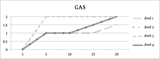 Vervolgens is er een Goal Attainment Scale gemaakt (Schlosser, 2004) van de door Daan gestelde doelen. De doelen zijn meetbaar gemaakt door een schaalverdeling te maken van -1 naar 2. Daan is gevraagd om vervolgens heel concreet bij -1: de teruggang te beschrijven, bij 0: de huidige situatie, bij 1: enige vooruitgang en bij 2: het uiteindelijke doel. Zo was voor hem vooraf duidelijk hoe de verslechtering en hoe de verbetering eruit zou zien. Iedere vijf sessies is Daan gevraagd om zijn doelen op deze schaal te scoren. De resultaten werden in een grafiek verwerkt (zie figuur 9) en met Daan besproken.
