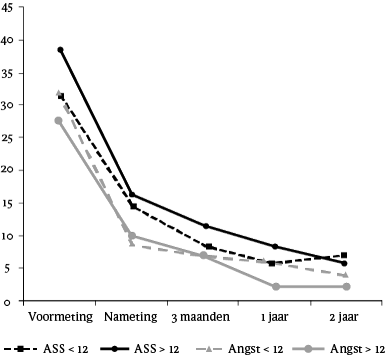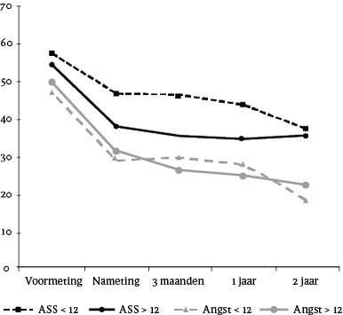 In tabel 3 zijn ook de resultaten van de multi-level-analyse te vinden wat betreft de angstsymptomen. Figuur 2 geeft deze resultaten grafisch weer. De predictoren tijd zijn significant, wat betekent dat ten opzichte van de voormeting de angstsymptomen zijn afgenomen bij de nameting en de follow-up metingen (zie ook figuur 2). Ook hier is het effect van verandering groot (de parameter estimates van tijd zijn groter dan .80). De predictor groep is significant, wat betekent dat over alle onderzoeksmetingen heen (dus gemiddeld genomen over de voormeting, de nameting en de follow-up metingen) de kinderen uit de ASS-groep hogere scores hebben op de SCARED-71 (angstsymptomen) dan de kinderen uit de Angstgroep. De grootte van het effect is medium. De interacties tussen tijd en groep zijn niet significant, wat betekent dat het effect van de CGT voor de ASS-groep en de Angstgroep niet verschillend is (ook te zien aan de overwegend parallel lopende grafieklijnen in figuur 2). De predictor leeftijd is niet significant, wat betekent dat de ernst van de angstsymptomen niet verschillend is voor kinderen < 12 jaar of ≥ 12 jaar. De interacties tussen tijd en leeftijd zijn niet significant, op één uitzondering na: de interactie leeftijd*tijd 3 is significant (p = .049), wat betekent dat bij follow-up 2 (een jaar na behandeling) – onafhankelijk van wel/geen ASS-diagnose – de angstsymptomen voor de kinderen ≥ 12 jaar iets sterker zijn afgenomen in vergelijking met de kinderen < 12 jaar (zie figuur 2). Voor de overige meetmomenten (nameting, 3 maanden na behandeling en 2 jaar na behandeling) geldt dat het voor de afname van angstsymptomen over tijd (behandeleffectiviteit van CGT) niet uitmaakt of het kind < 12 jaar of ≥ 12 jaar is.