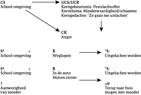 In de klassieke component van de functieanalyse stellen we dat wanneer Luk in de buurt van een school komt het gevoel van angst bij hem wordt geactiveerd. Dit komt doordat deze omgeving voor hem verbonden is met de verwachting dat andere kinderen hem gaan uitlachen. De oorzaak hiervan is te vinden in zijn pestverleden. Als thema houdt dit verband met minderwaardigheid en schaamte.