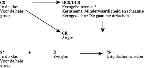 In aanvulling op de eerste klassieke functieanalyse (zie figuur 1) ontdekten we bij Luk een tweede, dieper liggende laag, die aanleiding gaf tot het formuleren van een tweede klassieke functieanalyse, namelijk de UCS/UCR, die verwijst naar oncontroleerbare, onvoorspelbare en complexe sociale situaties. Deze situaties zijn verbonden met het kernthema veiligheid. Het gaat hier om een aangeboren en niet-aangeleerde connectie die eigen is aan personen met ASS. Situaties die andere kinderen niet als bedreigend ervaren, zijn dat vaak wel voor Luk. De blootstellingsbehandeling zoals eerder beschreven werkte in deze analyse ook alleen in op de eerste oppervlakkige laag, namelijk het deconditioneren van zijn negatieve pestervaring. Maar na die exposure bleef bij Luk angst bestaan voor oncontroleerbare, onvoorspelbare en complexe sociale situaties. Exposure verandert immers niet de aangeboren gevoeligheid om prikkels te associëren met deze UCS/UCR-representatie.