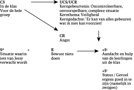 In de klassieke component van de functieanalyse gaan we ervan uit dat de angst van Jessy vooral ontstond als ze moest spreken in de klas, wanneer alle leerlingen haar konden horen. Ze dacht dat ze iets stoms zou zeggen en dat ze haar zouden uitlachen. Door haar stilzwijgen kon Jessy vermijden dat ze werd uitgelachen (operant).
