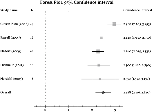 Figuur 1 Meta-analyse van studies naar ambulante schematherapie voor borderline-persoonlijkheidsstoornis: pre-post-changes (uit: Jacob & Arntz, 2013)