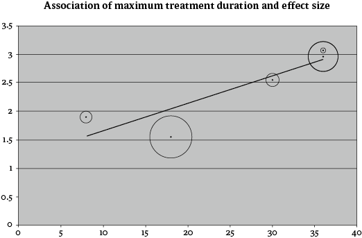 Figuur 2 Meta-regressie van de relatie tussen behandelingsduur (in weken, x-as) en effect size (Cohens d, pre-post-verandering, y-as) over verschillende studies naar ST voor BPS (Jacob & Arntz, 2013). De steekproefgrootte van de studie wordt gerepresenteerd door de grootte van de cirkels.