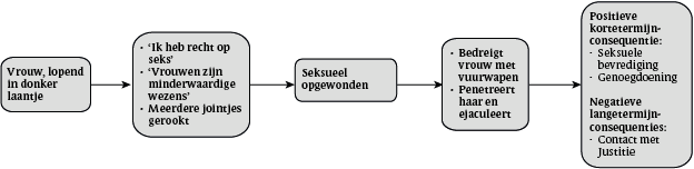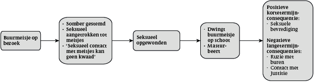Nadat een holistische theorie of een heuristisch model voor de verschillende probleemgebieden is geformuleerd, kunnen functionele analyses van gedrag worden opgesteld (figuur 3 en figuur 4) en kan aan de hand daarvan een behandelplan met specifieke behandeldoelstellingen worden vastgesteld (De Raedt & Schacht, 2003; Haynes & O'Brien, 2000; Sturmey & McMurran, 2011). Een voorbeeld van een functionele analyse bij een kindermisbruiker wordt weergegeven in figuur 3. Deze analyse wijst in de richting van een behandeling onder andere in de vorm van cognitieve herstructurering (het vervangen van cognitieve vervormingen door prosociale cognities), in combinatie met een medicamenteuze interventie.