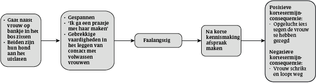 Een voorbeeld van een functionele analyse tijdens het rollenspel van een kindermisbruiker wordt weergegeven in figuur 5. Deze analyse laat zien hoezeer de deelnemer moeite heeft met het maken van een praatje met een volwassen vrouw en geneigd is veel te hard van stapel te lopen. Hij moet daarom in de rollenspelen de verschillende stappen in het leggen van contact oefenen, alvorens hij met haar een afspraak zou kunnen maken.