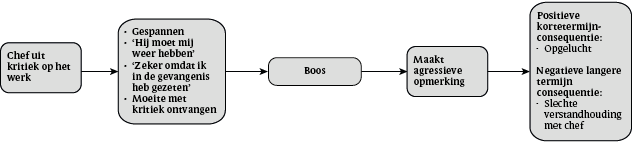 Figuur 6 geeft een functionele analyse tijdens het rollenspel door een verkrachter weer. Deze analyse toont het inadequaat reageren van de deelnemer op kritiek van een chef. Daarom wordt hem in rollenspelen geleerd hoe kritiek te ontvangen wanneer die naar zijn mening terecht is, en hoe te reageren als hij het met de kritiek niet eens is.