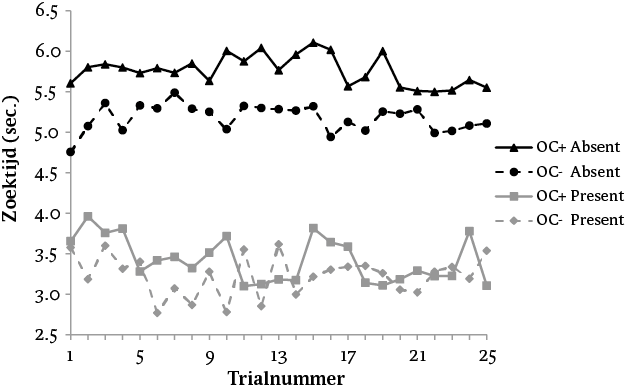 Zoals ook te zien is in figuur 3, zochten beide groepen significant langer in target-absent-trials (M = 5,85, SD = 1,35) dan in target-present-trials (M = 3,71, SD = 0,79; zie tabel 3 voor ANOVA-resultaten). Er was geen hoofdeffect van groep: over de gehele taak genomen verschilde de OC--groep niet van de OC+-groep in zoektijd. De cruciale groep (OC-/OC+) × conditie (target-absent/target-present) interactie was wel significant. Gepaarde vergelijkingen lieten zien dat in target-present-trials de OC-groep (M = 3,64, SD = 0,74) niet verschilde van de OC+-groep (M = 3,78, SD = 0,84) in zoektijd (t (107) < 1, p = 0,37), terwijl in target-absent-trials de OC+-groep (M = 6,05, SD = 1,38) een trend liet zien in het significant langer zoeken dan de OC--groep (M = 5,66, SD = 1,30) (t (107) = 1,51, p = 0,068 (eenzijdig), d = 0,29).
