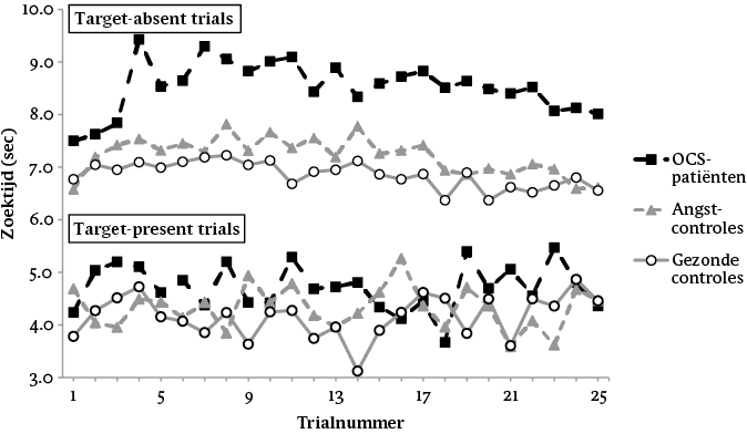 Figuur 4 Studie 3: gemiddelde zoektijd (in seconden) per trial in target-absent-trials en target-present-trials, voor respectievelijk OCS-patiënten, angstcontroles en gezonde controles