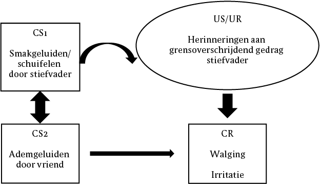 Verondersteld werd dat er mogelijk reeds een aanleg voor (over)gevoeligheid voor bepaalde geluiden aanwezig was, maar dat de misofonie pas een probleem werd na de gebeurtenissen met stiefvader. Conceptueel werd aangenomen dat de smak-, fluister- en loopgeluiden die stiefvader produceerde (CS-en) vooral beladen herinneringen uit de jeugd van patiënte activeerden (US/UR) en dat er in die zin dus sprake was van een referentieel verband. De aanname die hieraan ten grondslag ligt, is dat er een associatie wordt verondersteld tussen de misofonietriggers (CS) en de herinneringen met betrekking tot stiefvader (US/UR). Meer in het bijzonder zegt deze visie dat de huidige heftige emotionele reacties van patiënte (CR) op de triggers verklaard kunnen worden als reactivering van de angst en walging ten gevolge van de ervaringen met stiefvader van destijds. De uitbreiding naar andere misofonietriggers werd in de casusconceptualisatie gezien als het gevolg van stimulusgeneralisatie en/of conditionering van hogere orde. Op grond van deze aanname waren de voor de hand liggende interventies respectievelijk contraconditionering van de CS-en en/of directe herevaluatie, dat wil zeggen een interventie gericht op verwerking van (ten minste) de twee nare ervaringen met stiefvader. In de BA in figuur 1 wordt de casusconceptualisatie weergegeven.