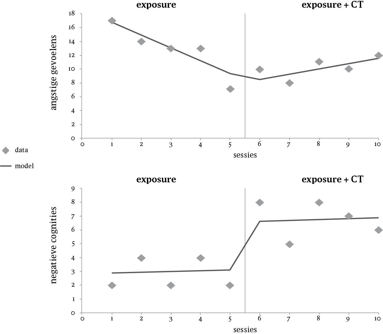 Uit de resultaten (zie figuur 1) blijkt dat de niveaus van angstgevoelens significant lager zijn aan het einde van de EXP-fase dan aan het einde van de EXP+CT-fase (b1 = 2,21, t = 3,02, p < 0,05). Er is ook een significant sterkere verandering in angstgevoelens in de EXP-fase ten opzichte van de EXP+CT-fase (b3 = -2,59, t = -8,53, p < 0,01). De exposurefase was bij deze cliënte dus effectiever dan de cognitieve-therapiefase; in deze laatste fase lijken de angstsymptomen zelfs te verslechteren. Hetzelfde lijkt te gebeuren met veranderingen in de tweede uitkomstmaat. Aan het einde van de EXP-fase zijn significant lagere niveaus van negatieve cognities te zien dan aan het einde van de EXP+CT-fase (b1 = 3,75, t = 6,98, p < 0,01). Er zijn echter geen significante verschillen gevonden in de snelheid van de verandering in cognities tussen de twee fasen.