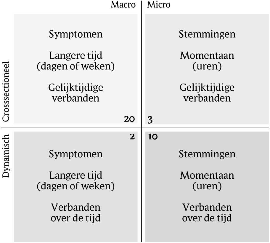 Sommige van deze netwerkstudies hebben naast symptomen of momentane stemmingen ook andere variabelen meegenomen in het netwerk, zoals motivatie, actief gedrag, ervaring van stress, de aanwezigheid en waardering van gezelschap, het verlies van een partner, andere negatieve levensgebeurtenissen, sociale druk of genen (zie tabel 1). Het is zeer relevant om rekening te houden met deze factoren, omdat ze waarschijnlijk ook van belang zijn voor, en deel uitmaken van, de dynamiek tussen symptomen of stemmingen die we veronderstellen vanuit de netwerktheorie. Echter, vanwege het specifieke karakter van deze studies en de invloed die deze extra factoren hebben op netwerkmaten, zullen we bij het vergelijken van bevindingen uit netwerkstudies in dit artikel vooral ingaan op de studies (n = 33) die zich enkel richtten op de onderlinge dynamiek tussen symptomen of momentane stemmingen zelf. In de meeste studies zijn depressieve symptomen gemeten over een wat langere tijd (afgelopen week of weken), via diagnostische interviews of vragenlijsten, als knopen in het netwerk (n = 22). We zullen dit vervolgens 'netwerkonderzoek op 'macroniveau' noemen. Er waren ook elf studies die momentane stemming gebruikten als knopen in het netwerk (zie figuur 1). Die wordt gemeten met frequente vragen, vaak meerdere keren per dag, naar iemands stemming op het moment zelf, zoals somberheid, irritatie, of opgewektheid. We noemen dit vervolgens 'netwerkonderzoek op 'microniveau', omdat we hier naar processen op een andere, namelijk kleinere, tijdsschaal kijken (meerdere malen binnen een dag).