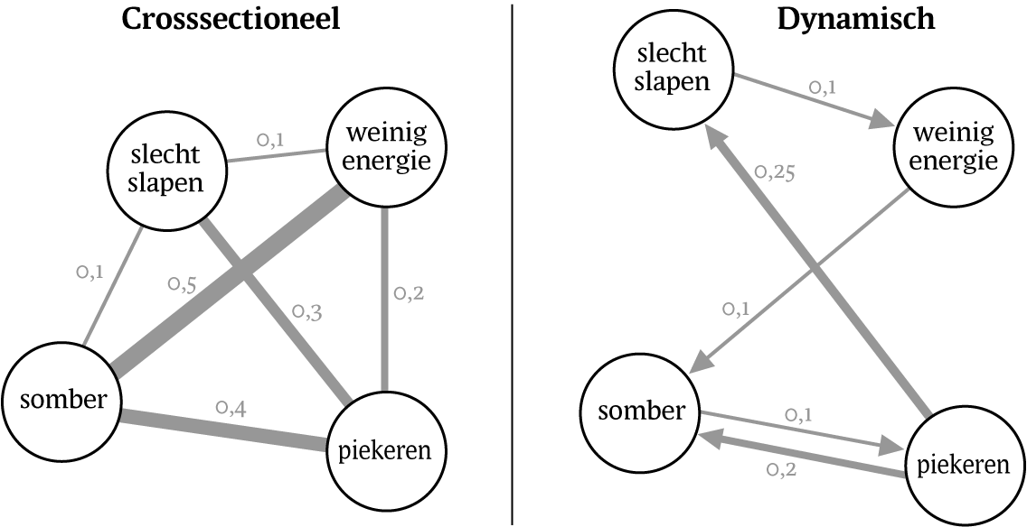 Figuur 2 Voorbeelden van een crosssectioneel en dynamisch netwerk. In het crosssectionele netwerk is somberheid het meest centrale symptoom (0,1 + 0,4 + 0,5 = 1,0), omdat dat de sterkste verbindingen heeft met de andere symptomen. In het dynamische netwerk heeft piekeren de hoogste uitgaande centraliteit, want dit symptoom voorspelt het sterkst andere symptomen (0,25 + 0,2 = 0,45). Het symptoom met de grootste ingaande centraliteit is hier somberheid (0,1 + 0,2 = 0,3), omdat dit symptoom het sterkst voorspeld wordt uit andere symptomen.