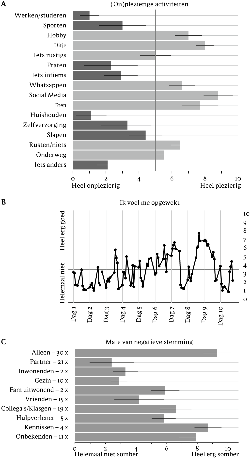 Op deze wijze kan de waardering van dagelijkse activiteiten worden weergegeven (A), maar ook schommelingen in stemming (B) en stemming in diverse typen gezelschap (C). Ervaringen met dergelijke feedback worden momenteel onderzocht bij mensen met een bipolaire stoornis en mensen met een psychose.