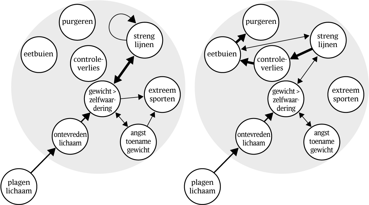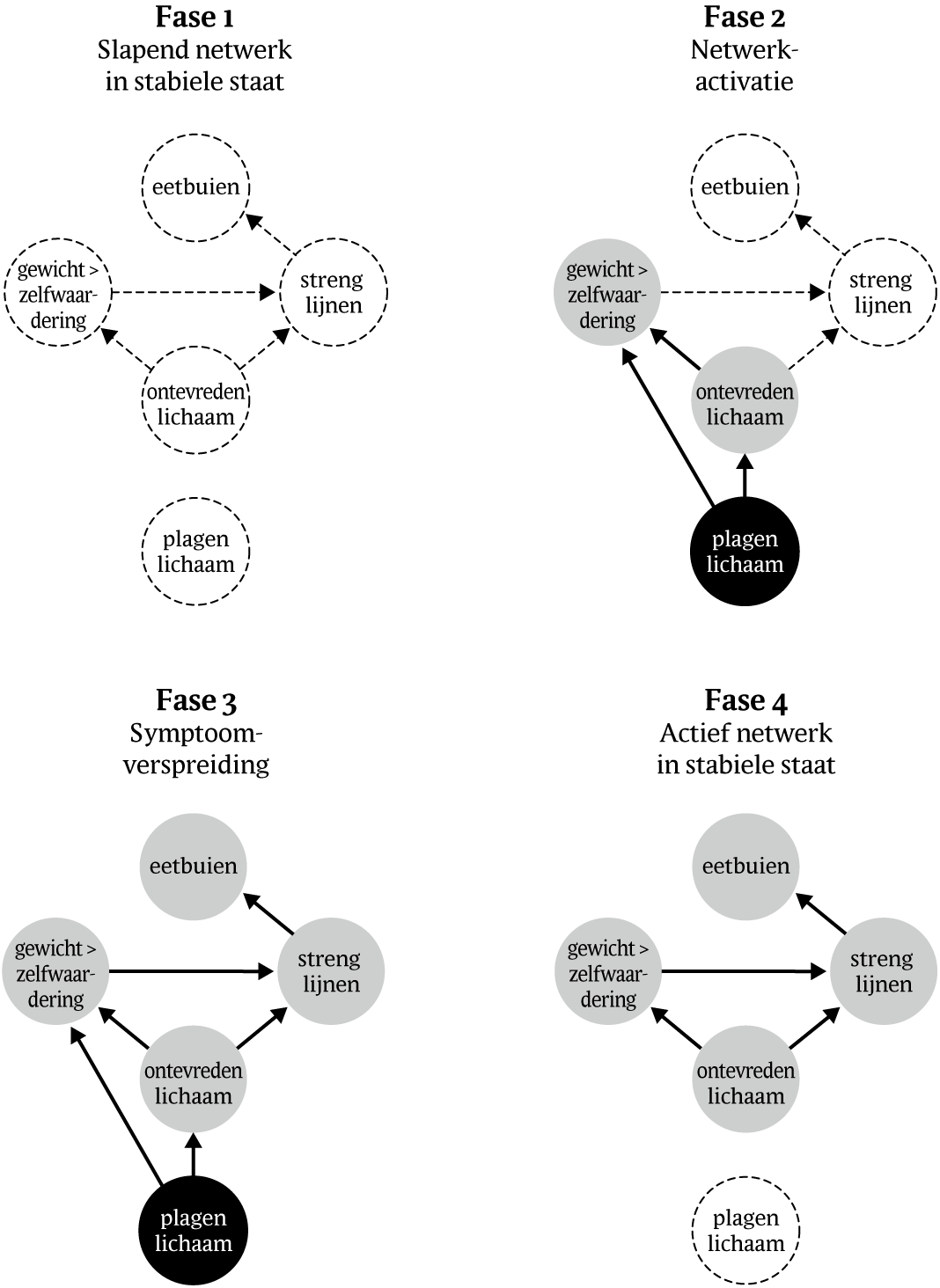 Figuur 4 (gebaseerd op figuur 3, p. 9 in Borsboom, 2017) illustreert dit principe voor de ontwikkeling van een eetstoornis. Borsboom (2017) onderscheidt vier fasen in de ontwikkeling van een mentale stoornis. In fase 1 heeft een patiënt nog geen symptomen en 'slapen' de verbindingen tussen de symptomen (dat wil zeggen, ze reflecteren wat er zou gebeuren als een symptoom wordt geactiveerd). In fase 2 wordt het netwerk van eetstoornissymptomen geactiveerd door een externe trigger, bijvoorbeeld door een opmerking over lichaamsvorm of gewicht. Dit kan het symptoom 'lichaamsontevredenheid' activeren en het symptoom 'gewicht bepaalt zelfwaardering'. Relevant is dat sommige risicofactoren voor eetstoornissen (zoals lichaamsontevredenheid; Stice, Marti, & Durant, 2011) ook een symptoom zijn van eetstoornissen. De netwerkbenadering zou dat modelleren als de activatie van een symptoom waarbij de rest van het symptoomnetwerk (nog) niet is geactiveerd. In fase 3 verspreidt de activatie zich door het netwerk en raken meer symptomen geactiveerd. Dit gebeurt alleen in netwerken waarin zulke connecties tussen symptomen bestaan. Omdat een veerkrachtiger netwerk minder sterk is verbonden, is daarin de kans op verspreiding van activatie naar andere symptomen uiteraard kleiner. In het voorbeeld kunnen in fase 3 de symptomen 'streng lijnen' en 'eetbuien' geactiveerd raken. In fase 4 verdwijnt de externe trigger (stopt het commentaar op lichaamsvorm of gewicht), maar in een sterk verbonden netwerk zullen symptomen elkaar blijven activeren. Het netwerk houdt zichzelf in stand en de patiënt houdt last van de eetstoornis.