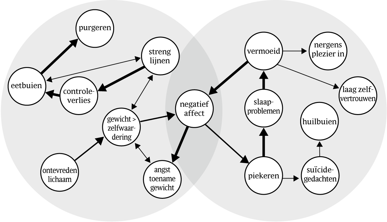 Figuur 4 Ontstaan van een eetstoornis volgens de netwerkbenadering. Zie uitleg in tekst. Gebaseerd op figuur 3 in Borsboom (2017).