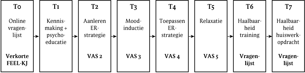 Verandering in affect: Om te meten in welke mate het affect van adolescenten veranderde tijdens de training werd de sterkte van positief en negatief affect gemeten aan de hand van visuele analoge schalen (VAS). Daarbij scoorden adolescenten gevoelens van blijheid, verdriet, angst en boosheid op een schaal van 0 (helemaal niet aanwezig) tot 100 (heel sterk aanwezig) (Aitken, 1969; Bond & Lader, 1974). Dit gebeurde op vier verschillende momenten: T2, T3, T4 en T5 (zie figuur 1).