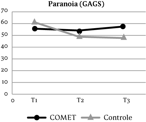 Het meedoen aan COMET leidde in dit onderzoek niet tot vermindering van paranoia. Op de zelfrapportagevragenlijst, de GAGS, werden geen significante effecten gevonden. Ook was er geen interactie-effect. Dit betekent dat paranoia tijdens het huidige onderzoek voor beide condities niet toe- of afnam. Er werd vooraf verwacht dat het invullen van een vragenlijst over achterdocht bij participanten die veel last hebben van achterdocht mogelijk ingewikkeld zou zijn of dat de participanten door hun achterdocht niet in staat zouden zijn om op alle items een eerlijk antwoord te geven. Om die reden is exploratief gekeken naar de resultaten van het interview, specifiek het item 5 Achterdocht op de PANSS. Het ontbreken van een effect op achterdocht kan mogelijk verklaard worden door verschillende factoren. Ten eerste wordt gezien dat het zelfbeeld over de drie meetmomenten toeneemt en niet specifiek ten tijde van de training (tussen T1 en T2). De verwachting was dat na toename van het zelfbeeld de achterdocht zou afnemen, aangezien COMET zich in eerste instantie richt op verbetering van het zelfbeeld. De follow-up vond plaats na 8 weken. Mogelijk is deze periode te kort geweest om een effect op paranoia te zien en vindt een afname van paranoia na dit onderzoek alsnog plaats. Ten tweede is het mogelijk dat de mate van paranoia van invloed is geweest op het eerlijk invullen van de zelfrapportagevragenlijst, waardoor de mate van achterdocht bij de eerste meting lager gerapporteerd werd dan werkelijk het geval was. Als laatste zou het kunnen dat andere factoren dan alleen zelfbeeld de achterdocht in stand houden bij deze doelgroep en er andere interventies nodig zijn om de paranoia te reduceren.