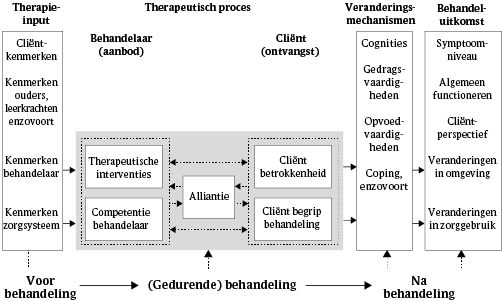 Het theoretisch model van Fjermestad, McLeod, Tully en Liber (2016) beschrijft hoe behandeluitkomst tot stand komt. In het overkoepelende model wordt onderscheid gemaakt tussen de therapie-input, het therapeutisch proces, de veranderingsmechanismen en de behandeluitkomst (zie figuur 1). Het therapeutisch proces wordt vervolgens verder uitgesplitst in enerzijds generieke en specifieke of technische interventies die behandelaren inzetten (generiek: gedrag van behandelaren, technisch/specifiek: therapeutische technieken zoals exposure of cognitieve herstructurering, ook wel 'ingrediënten' of 'kernels' genoemd) en de competentie van behandelaren daarbij, en anderzijds in factoren die te maken hebben met de cliënt: betrokkenheid bij en in de behandeling, en begrip van de behandeling. De vier procesfactoren (te weten: interventies, competentie, betrokkenheid en begrip van behandeling) laten volgens dit model een samenspel zien dat gefaciliteerd wordt door een vijfde procesfactor: de relatie tussen therapeut en cliënt, de zogeheten therapeutische alliantie. Bij de behandeling van kinderen verwijst therapeutische alliantie zowel naar de affectieve relatie tussen behandelaar en cliënt ('band') als naar de mate van overeenstemming tussen behandelaar en cliënt over de therapeutische taken die nodig zijn om de therapiedoelen te behalen ('taken') (Fjermestad et al., 2016; Liber et al., 2007).