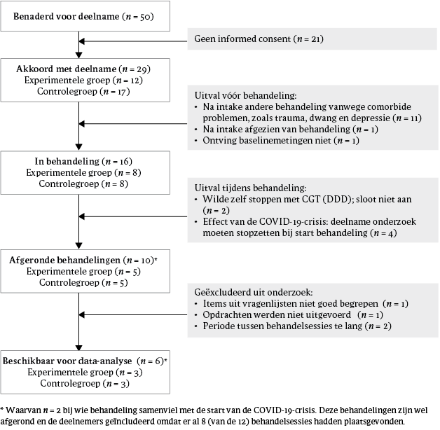 Deelnemers waren jongeren met angstklachten die zich hadden aangemeld bij een van de afdelingen Ambulante Behandeling Jeugd van een vestiging van Eleos ggz in Nederland. Zij werden verwezen door de huisarts of het sociale (wijk)team. De meerderheid van de cliënten van Eleos heeft een protestants-christelijke achtergrond, maar Eleos biedt ook hulp aan niet-christelijke cliënten. Vijf deelnemers werden na intake gediagnosticeerd met een angststoornis volgens de DSM-5. In de intakefase werden de DSM-5-criteria systematisch uitgevraagd. Er zijn geen diagnostische interviews afgenomen. Bij één deelnemer waren de angstklachten gerelateerd aan een 'andere gespecificeerde psychotrauma- of stressorgerelateerde stoornis'. Cliënten met acute suïcidaliteit, met een IQ < 80 of die niet afkomstig waren uit een christelijk milieu, waren gecontra-indiceerd. Leeftijd voor inclusie was 10 tot en met 18 jaar. In totaal zijn 50 cliënten benaderd om mee te doen. In figuur 1 is de flowchart van inclusie en drop-out weergegeven. De redenen voor drop-out in de groep 'in behandeling' (N = 17) zijn bekend en hebben vooral te maken met organisatorische aspecten. Daarom is er geen reden voor een drop-outvergelijking tussen 'beschikbaar voor data-analyse' (n = 6) versus de drop-outgroep (n = 11) wat betreft religieuze coping, en klinisch en existentieel herstel bij de start.