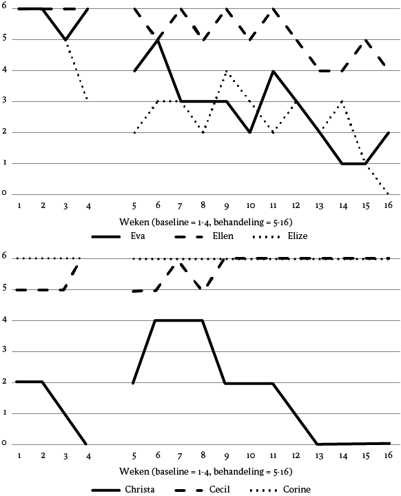 Het klinisch herstel is visueel weergegeven in figuur 2. De trend van klinisch herstel binnen de experimentele groep is een duidelijke afname in klachten bij Eva en Elize, en een lichte afname in klachten bij Ellen. Het verschil in gemiddelden (gepresenteerd in tabel 2) is hiermee in overeenstemming. Bij Eva en Ellen waren baselinescores stabiel en is verandering te zien tijdens of aan het einde van de behandelfase. Bij Elize waren klachten al minder aan het einde van de baselinefase – de fase is daarmee minder stabiel –, maar ook bij haar is aan het einde een daling in klachten te zien. Binnen deze groep lijkt het klinisch herstel in de eerste sessies van de behandeling stabieler en minder sterk dan in de laatste sessies. De trend van klinisch herstel binnen de controlegroep is een ander beeld. Christa rapporteerde (onverwacht) in de baselinefase weinig tot geen angstklachten, vervolgens een toename in de eerste helft van de behandelfase en aan het einde weer weinig tot geen klachten. Bij Cecil en Corine bleven klachten stabiel hoog, ongeacht de fase. De gemiddelde scores per fase waren in de behandelfase dan ook gelijk en zelfs hoger. Het visuele verschil tussen beide groepen is terug te zien in de verschillen in NAP-waarden met 95% CI: in de experimentele groep matig tot grote effecten van de behandeling en in de controlegroep geen effect in de verwachte richting (NAP ≤ 0,50).