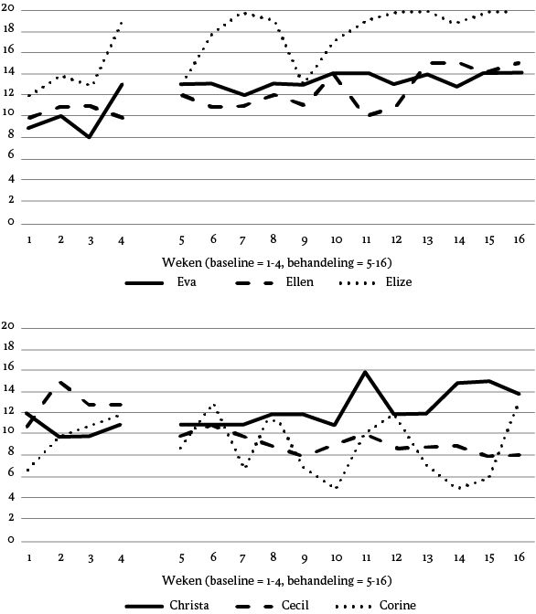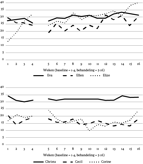 Het existentieel herstel is visueel weergegeven in figuur 3. De trend hiervan binnen de experimentele groep is wisselend in zowel de baselinefase als de behandelfase. Elize rapporteert in de behandelfase over de tijd een stabiele toename, met tussen sessie 7-8 en 14-16 een hogere stijging. Haar gemiddelde per fase verschilt het meest, met 8 punten (tabel 2). Bij Eva is ook een toename te zien, maar beperkter, met weinig fluctuatie. De scores voor Ellen zijn in de periode van de eerste behandelsessies lager dan de baselinefase, maar gaan vanaf sessie 12 omhoog (vergelijkbaar punt als voor klinisch herstel). De baselinefase was voor Elize weinig stabiel, met groot verschil tussen week 1 en 4 (verschil = 19). Voor Eva en Ellen laten de gemiddelden zien dat existentieel welzijn al relatief hoog was. Hetzelfde hoge baselineniveau was te zien voor Christa in de controlegroep, dat voor haar in de behandelfase stabiel bleef en gemiddeld licht steeg. Voor Cecil en Corine waren de baselinewaarden lager en was er meer fluctuatie in de behandelfase. Corine scoort bij sessie 1 en sessie 16 hoger dan de baseline, terwijl daartussen haar scores veelal lager waren. Voor Cecil is een lichte neerwaartse trend te zien. De NAP-waarden (tabel 2) in de experimentele groep lieten een matig effect zien van de behandeling voor Elize en Eva, maar voor Ellen geen effect in de verwachte richting (NAP = 0,36). In de controlegroep was alleen voor Christa de NAP-waarde positief over een effect van de behandeling.