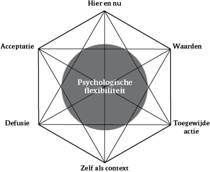 Het boek bestaat uit vier delen. In het eerste deel (hoofdstukken 1 tot en met 4) wordt het ACT-model uitgelegd en de onderliggende theorie besproken. Het tweede deel (hoofdstukken 5 tot en met 7) gaat over de uitvoering van een ACT-behandeling: hoe begin je en hoe bouw je je sessies op? In het derde deel (hoofdstukken 8 tot en met 29) worden de zes kernprocessen van ACT (zie figuur 1) uitgelegd aan de hand van klinische problemen. Het vierde en laatste deel (hoofdstukken 30 tot en met 32) gaat over de therapeutische relatie en de valkuilen voor de therapeut. Het boek is logisch opgebouwd en neemt je mee in de wereld van ACT. Daarnaast is het ook voor de therapeut die al bekend is met ACT een mooie aanvulling, vanwege de vele onderwerpen met bijpassende praktijkvoorbeelden.