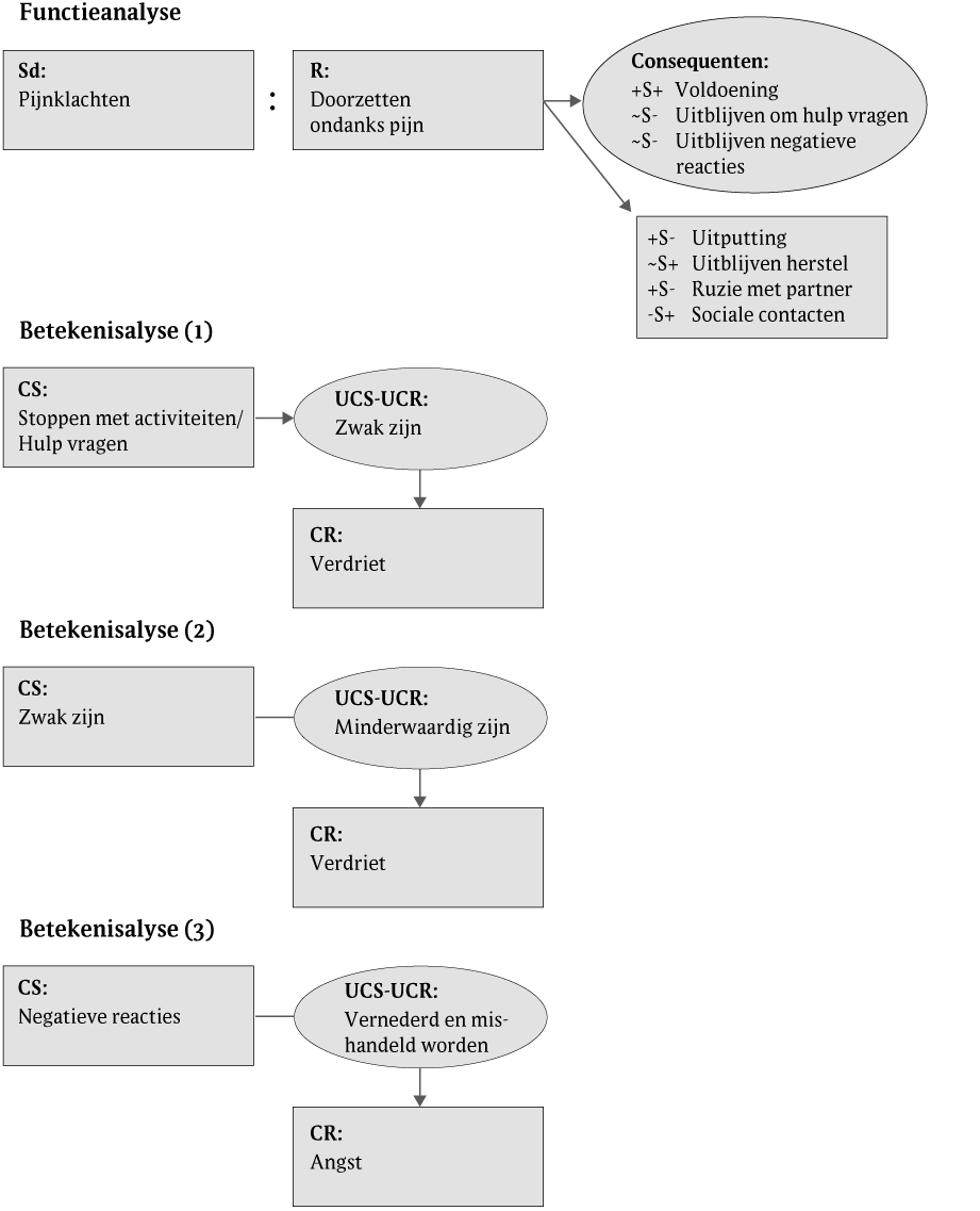 Zij kiest, in overleg met de therapeut, een behandeldoel gericht op het eerder kunnen stoppen van activiteiten en het accepteren van hulp van vrienden en professionele organisaties. Er worden functieanalyses en betekenisanalyses uitgevoerd om beter te begrijpen waarom het voor Lieneke zo moeilijk is om op tijd te stoppen en hulp te vragen (zie figuur 1).