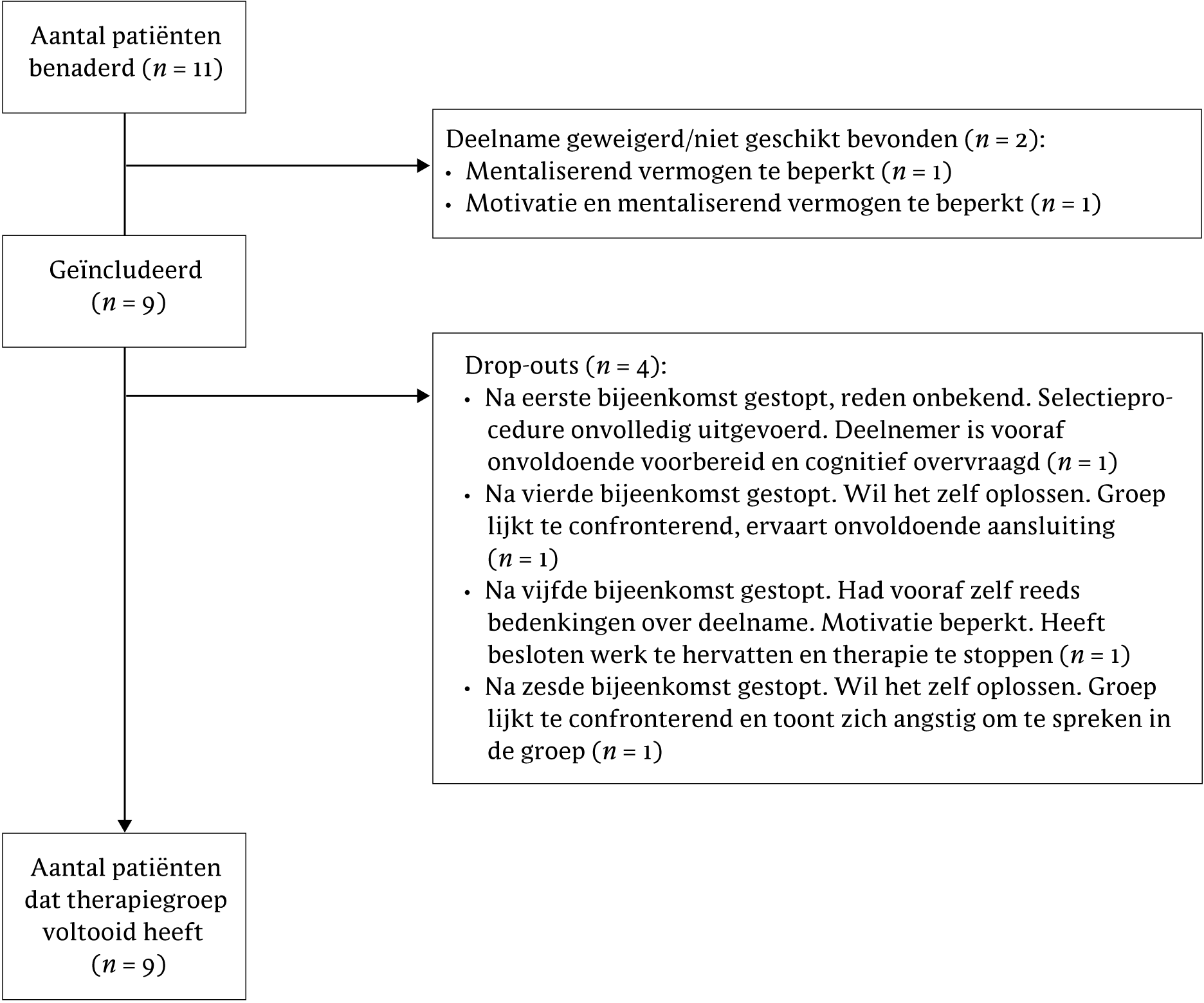De deelname aan de groep en de drop-out van de patiënten is in een flowchart weergegeven (figuur 1). In totaal werden er 11 patiënten na doorverwijzing van het VIP-team benaderd voor deelname aan de groepstherapie. Eén patiënt gaf zelf aan onvoldoende motivatie te hebben voor de groepstherapie en één patiënt werd vooraf geëxcludeerd vanwege een (zeer) beperkt mentaliserend vermogen. De groep bestond dus aanvankelijk uit negen patiënten, maar had vervolgens vier drop-outs, van wie één patiënt direct na de eerste sessie stopte. De reden hiervan bleef onbekend, omdat patiënt nadien niet meer bereikbaar was voor het behandelteam. Ook werd de selectieprocedure vooraf niet zorgvuldig uitgevoerd, want de patiënt had nog niet alle zelfrapportagevragenlijsten ingevuld. De andere drie drop-outs vielen in de beginfase van de therapie af (binnen de eerste zeven groepsbijeenkomsten) vanwege de volgende factoren: weinig verbinding/herkenning met de groepsleden, beperkte motivatie en een verhoogd angstniveau om te spreken in een groep. Dit komt neer op een drop-out van 44,4% na start van behandeling.